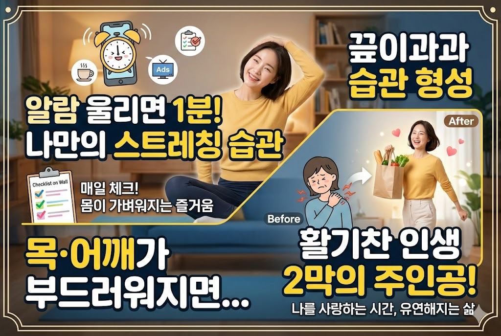 처음에는 뻣뻣했던 몸이 조금씩 부드러워지는 것을 느끼다 보면, 어느덧 몸뿐만 아니라 경직되어 있던 마음의 여유까지 되찾게 될 것입니다. 건강한 미래는 거창한 계획이 아니라 '지금 당장' 팔을 뻗는 실천에서 시작됩니다. 이 시리즈가 여러분의 활력 넘치는 인생 2막을 여는 가이드가 되길 응원합니다.