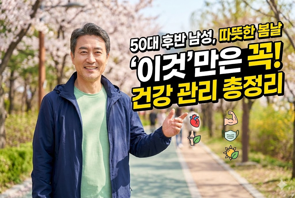 따뜻한 봄철, 50대 후반 남성은 급격한 일교차로 인한 **심혈관 질환 예방**, 겨울철 굳었던 **근육과 관절 부상 방지**, 황사와 미세먼지로부터 **호흡기 보호**가 핵심입니다. 비타민이 풍부한 제철 나물 섭취와 단계적인 유산소 운동을 병행하여 면역력을 강화하는 것이 필수입니다.